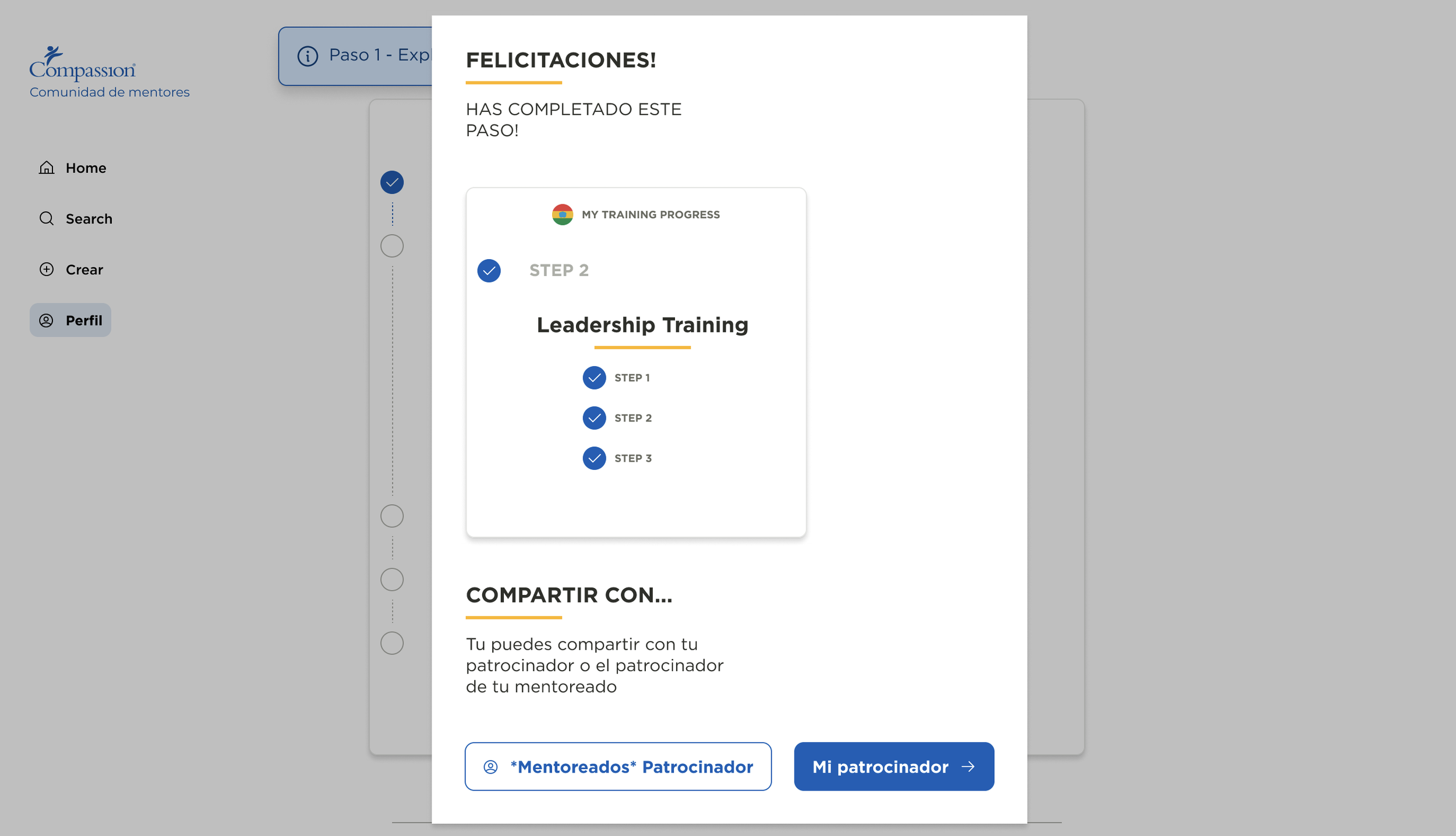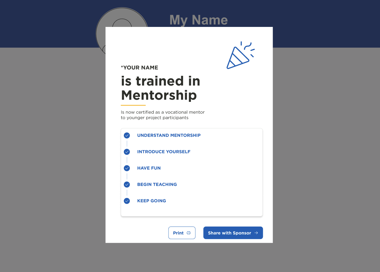 Finally, based on all of these insights, we determined that a digital platform with reusable trainings such as the mentorship training would be a highly positive experience and accomplish our goals. Progress tracking would promote a sense of healthy-identity even without a mentorship relationship. The ability to send updates on progress to a sponsor, to friends and tutors upon completion of individual steps in each training would be motivating and provide development activities with quick-touch communications alleviating the burden of long-form letter writing while also showing progress to sponsors in key areas.