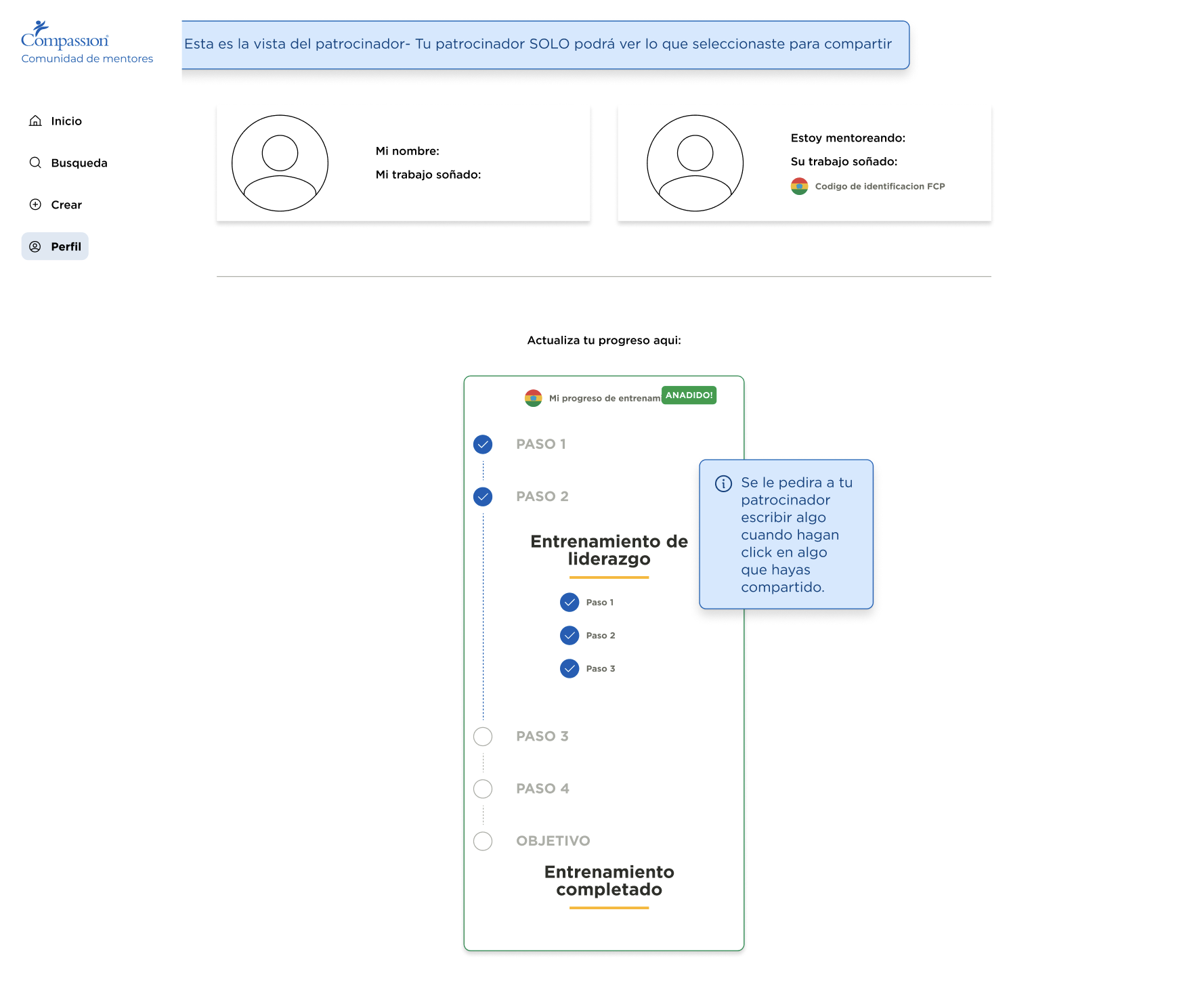 Once they received their certificate of completion for training, we would give them access to a digital tool for mentors. In this digital tool they would be able to set goals, access free trainings similar to the mentor training they just completed but more directly beneficial. They would be able to clearly see and track their progress in each one. At each milestone they were also given the option to share their progress with a mentor or a sponsor to gauge whether this would actually generate communications naturally.