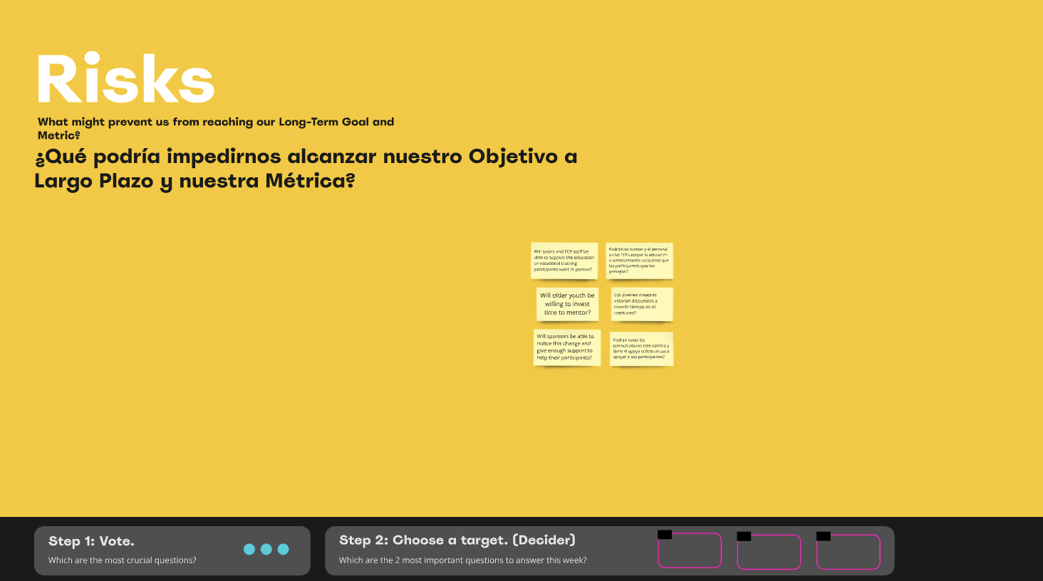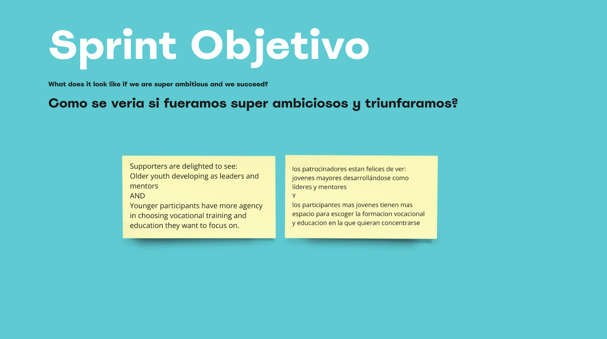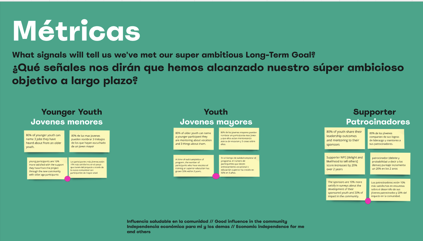 During the interviews, notes were taken in “How might we” (“Como sería”) format during the interviews, grouped into categories and refined into a single final “How might we” sentence to guide the rest of the sprint. Based on this sentence we crafted a goal and set of metrics and potential risks.